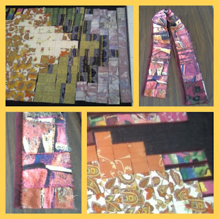 - Из синтепоновых полосок и прямоугольников разной длинны и ширины, которые были обрезаны от основной прокладки при изготовлении других изделий в технике квилт с рисунком печворк.